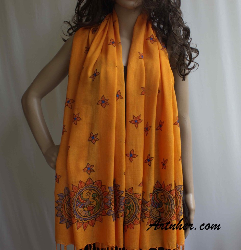 Orange color round fishes theme cotton art scarf hand painted by Madhubani artist.